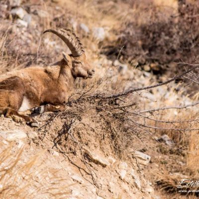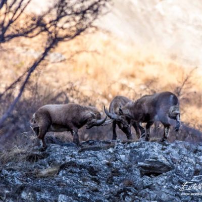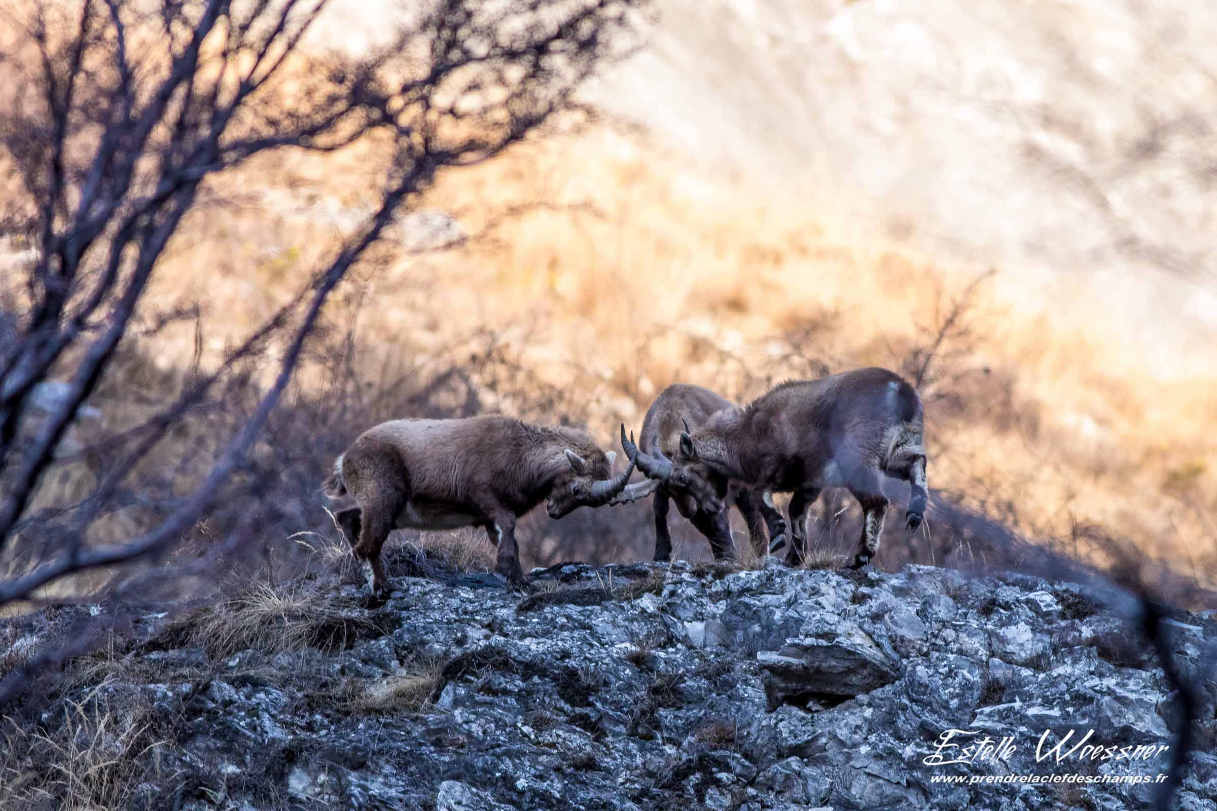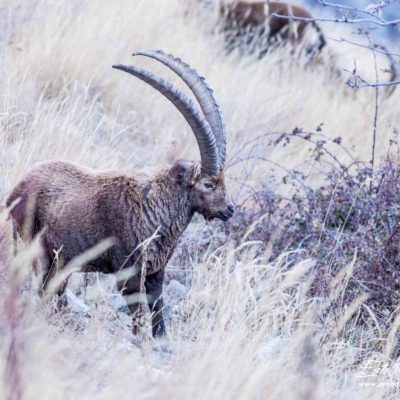 Mais ce n’est pas parce que les bouquetins se laissent approcher de près qu’il faut chercher à les approcher de trop près! Chaque bouquetin a sa distance de sécurité. Il faut bien observer son comportement pour ne pas le perturber. Si à votre approche le bouquetin qui était tranquillement couché à ruminer arrête de ruminer, voire se lève c’est que vous êtes trop près! Et en hiver tout dérangement peut être préjudiciable pour la survie d’un individu parce qu’il lui fait perdre inutilement de l’énergie. En plus en dérangeant les bouquetins leur observation sera beaucoup moins intéressante parce que vous ne les verrez que vous surveiller du coin de l’oeil ou pire vous les verrez fuir tout en haut dans les falaises, comportements peu intéressants à observer. Au contraire si vous vous asseyez sans bouger et à distance raisonnable tous les bouquetins du groupe continueront à vaquer à leur occupations sans se soucier de vous !