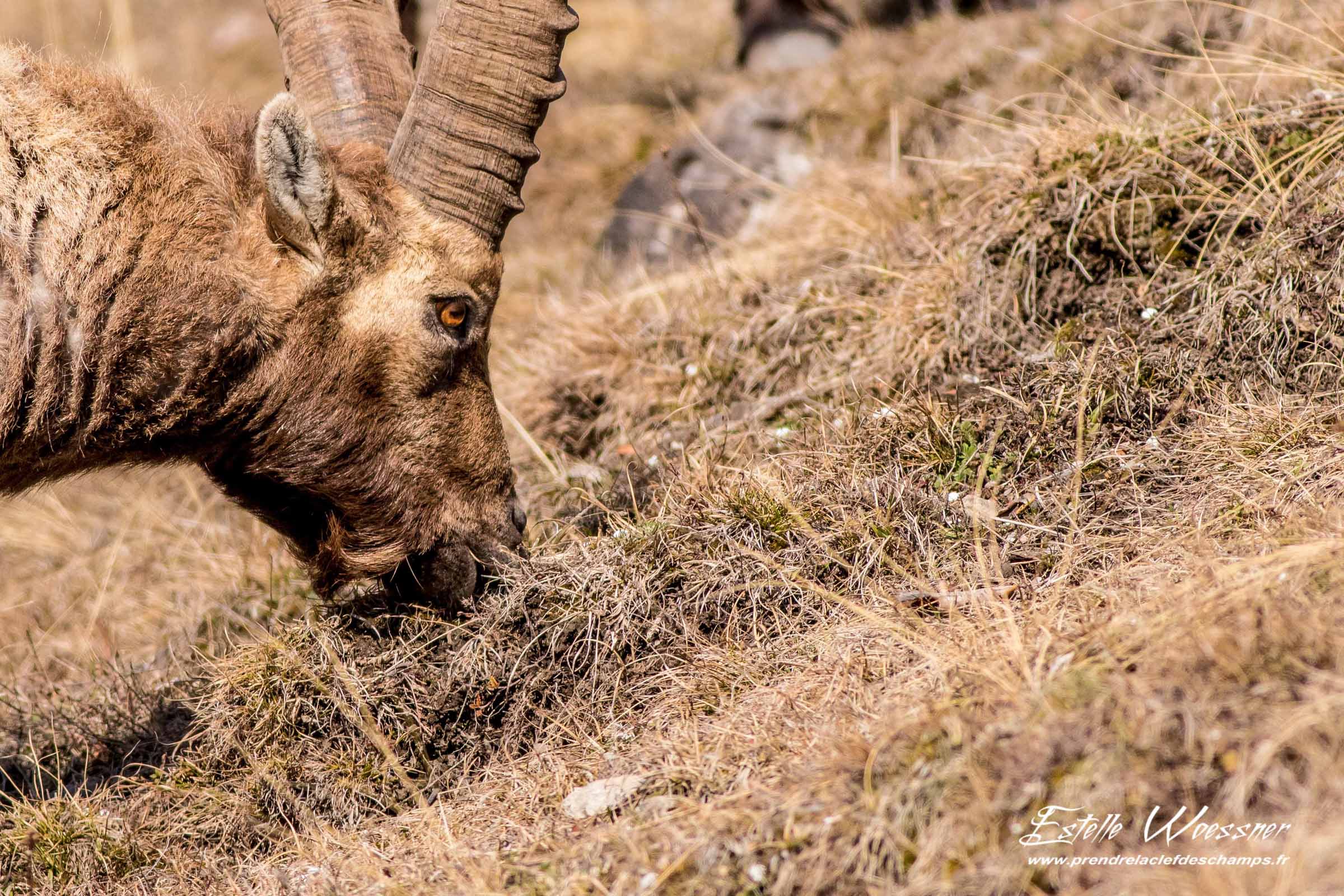Ceux qui broutent. A cette époque l’herbe ressemblerait presque au foin que l’on donne à nos animaux domestiques, mais elle est en réalité beaucoup plus pauvre en nutriments que le foin. En effet le foin est récolté en juin lorsque l’herbe est en pleine croissance et est riche en nutriments, alors que l’herbe mangée par les bouquetins a séché sur pied en automne, les nutriments sont donc stockés dans les racines par la plante…